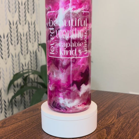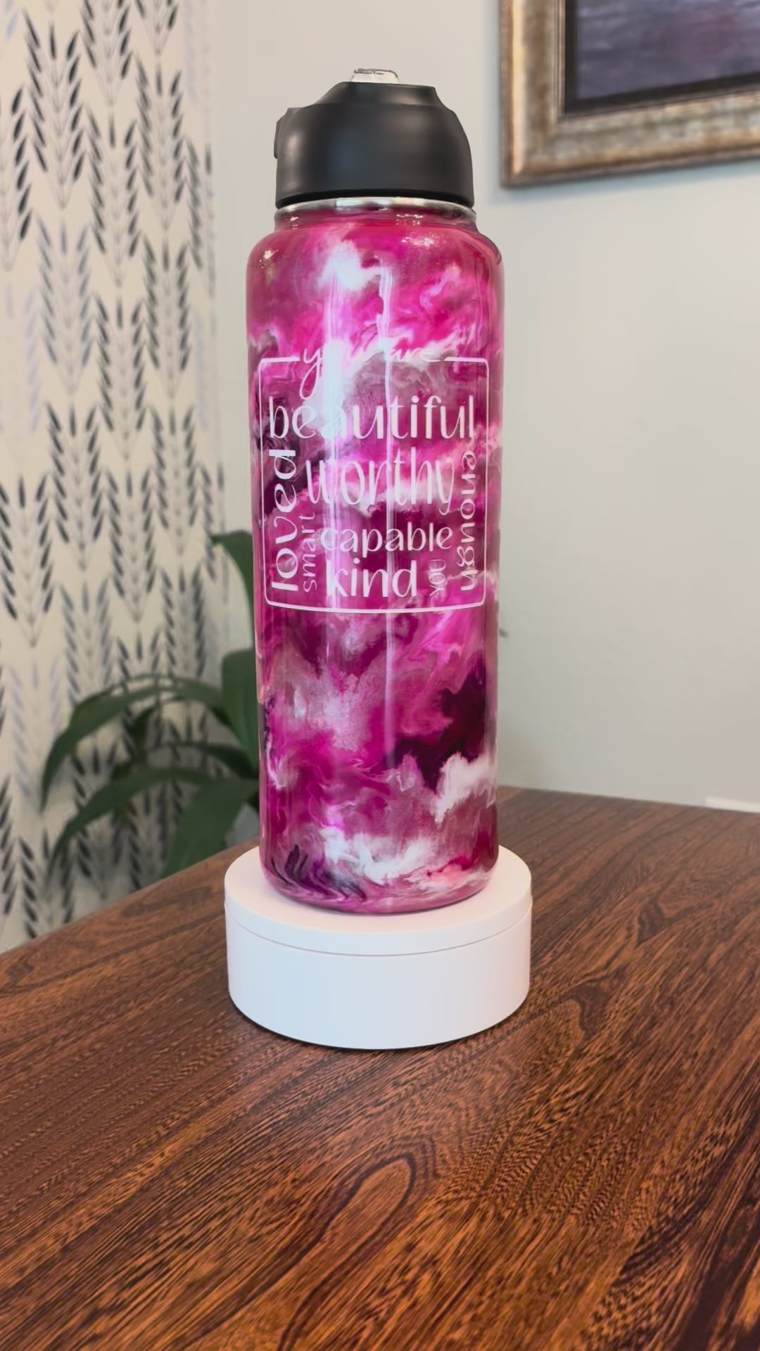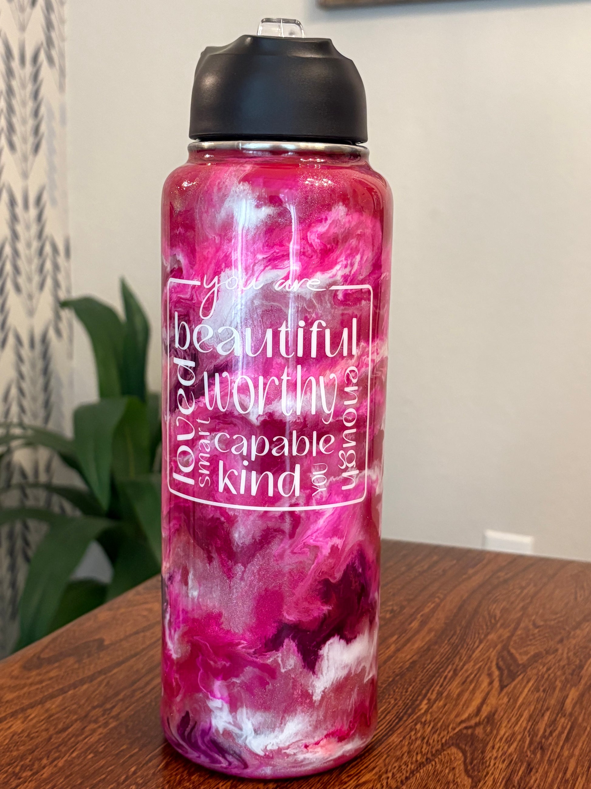 Made from stainless steel with double-wall insulation, this 40oz Hydro tumbler keeps your drinks just right for hours—cold stays cold, hot stays hot. It features two unique lids to mix up your sipping game. To keep it in tip-top shape, hand wash only—no soaking, dishwashers, or microwaves allowed. The vibrant alcohol inks, glitter, and or decals are sealed under a FDA-approved epoxy coating for long-lasting sparkle and strength.